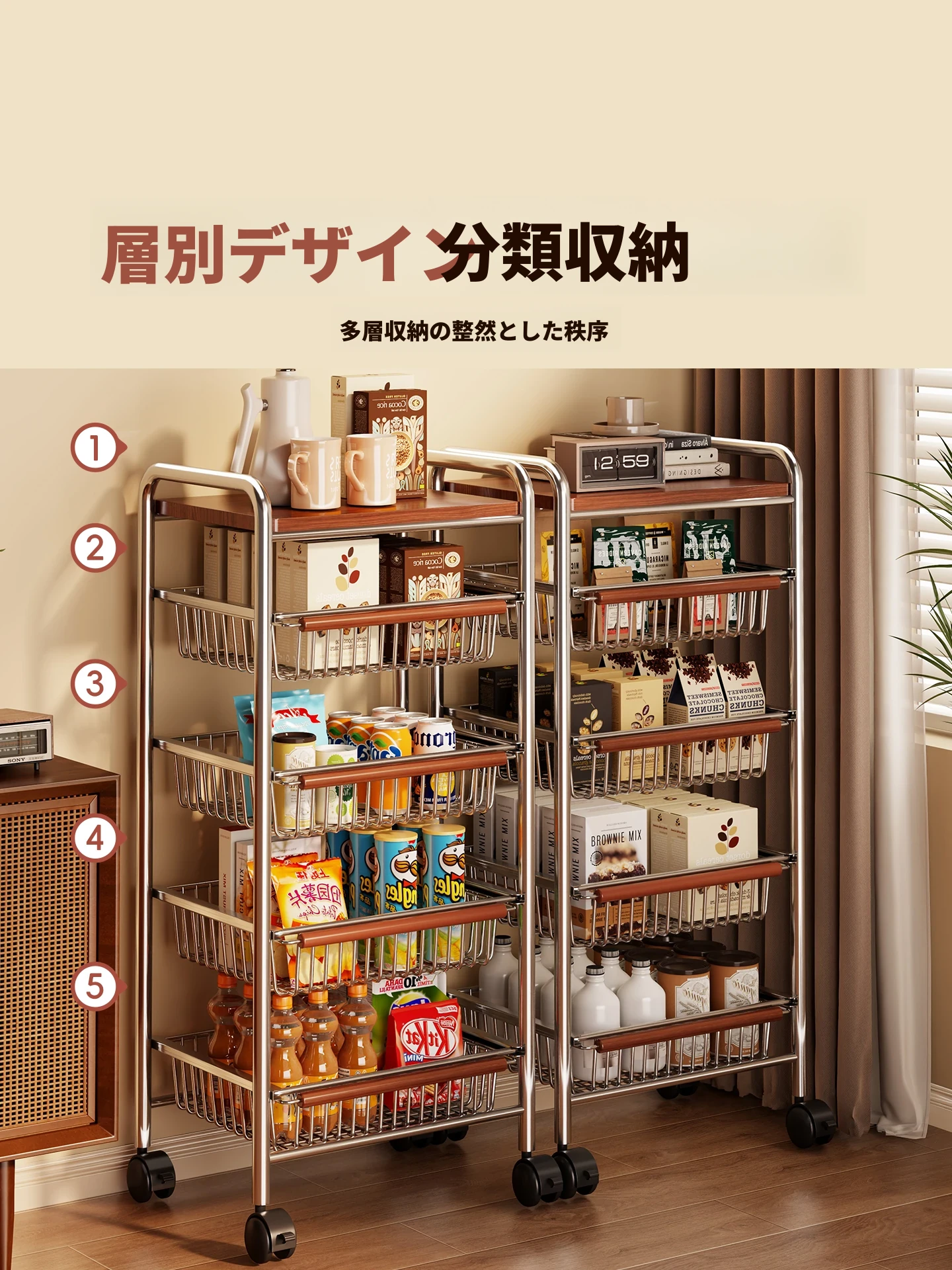 移動式小型カート!レトロ風の多層スナック収納ラック、キャスター付きで便利な家庭用サイドボード、隙間収納も可能!おしゃれで実用的な収納ソリューション。